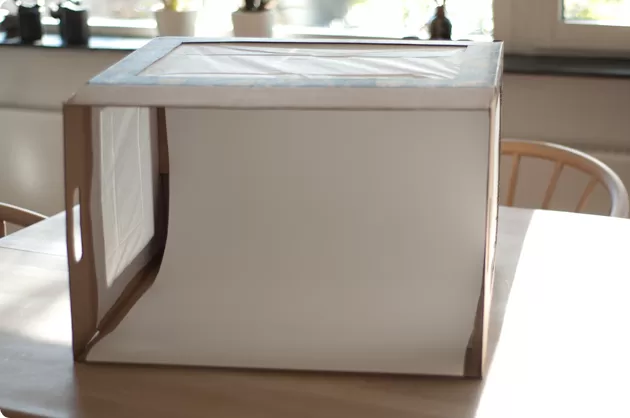 Nu skulle du være færdig og studiet er klar til brug. Hvis du ikke skal bruge lys fra oven af, kan du bruge det stykke pap, du skar ud som afdækning, det kan snilt ligge ovenpå silkepapiret.
