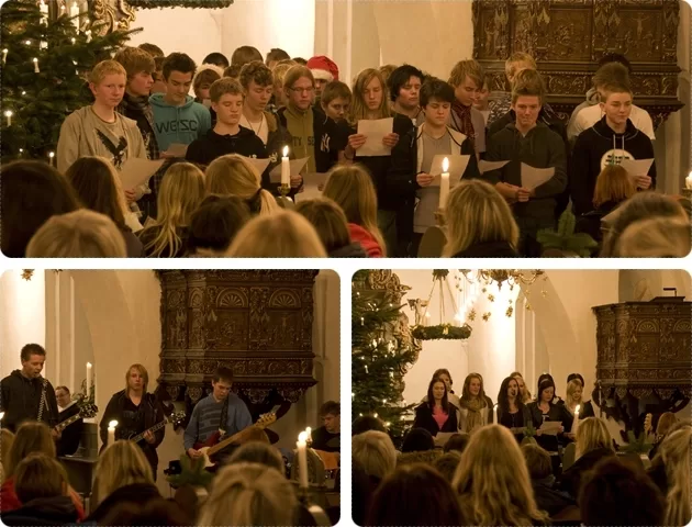 Afslutningen i kirken var præget af, at det var eleverne der stod for det meste. Indgangsbønnen og de andre bønner, blev læst af eleverne og pigerne havde indøvet nogle julesange som de fremførte af et par gange. Et par af eleverne har fingre, som med lethed kan danse over et piano, så det lyder som englene synger og de fremførte også et par numre. Skøn musik. Skolens heavyband spillede og sang også et enkelt nummer og jeg skal hilse og sige at det lød fabelagtigt. 🙂 Nu var det præstens tur og han gav os ”Den standhaftige Tinsoldat” af H. C. Andersen, og det gjorde han rigtig godt. Der er gået noget af en fortæller tabt i den præst. Jeg vil faktisk godt overvære nogle af han prædiger, for de må da være rigtige gode.