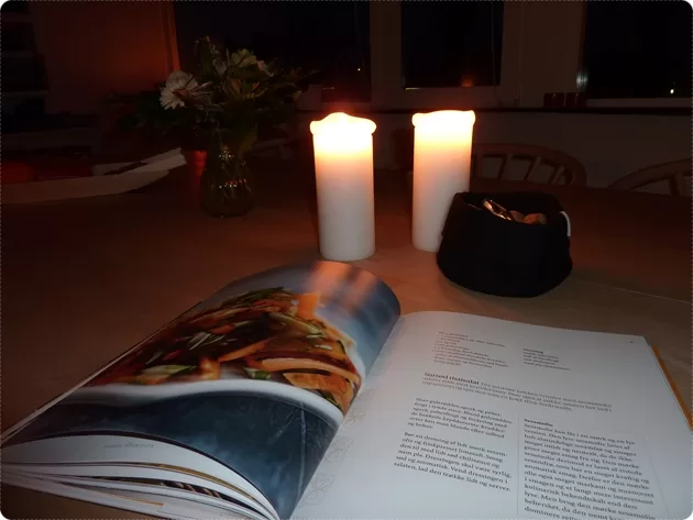 Nu er aftenen faldet på og der er helt mørkt udenfor, naaa ikke helt, der er lys op af vores trappe og de enkelte lygtepæle jeg kan se i rundkørslen derude i det fjerne er også tændt, men ellers er her mørkt. Jeg sidder ved stearinlysenes skær og læser i ”AnneMad – Små retter fra hele verdenen”, for noget af morgendagens mad, bliver lavet ud fra, et par af opskrifterne i bogen her. Umm jeg glæder mig allerede. 🙂