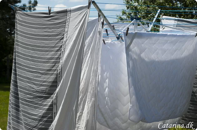 Siden vi kom hjem i går aftes, har vaskemaskinen nærmest ikke holdt pause, men det har jo også været nemt i dag, for tøjet har tørret på snoren hurtigere end en maskine kunne blive færdig. Nu er der vasket i bund og der er atter lagt rent og sommerduftende sengetøj på alle sengene og skabene bugner af rent tøj.