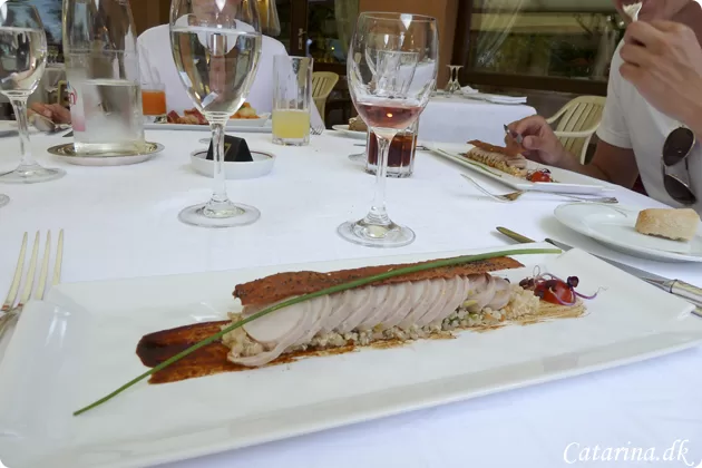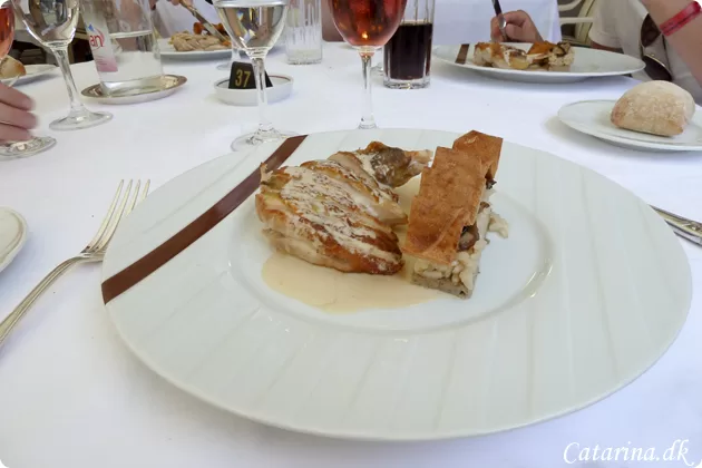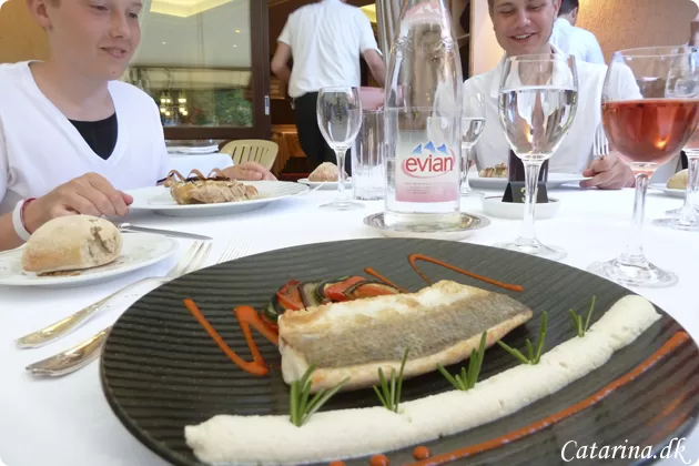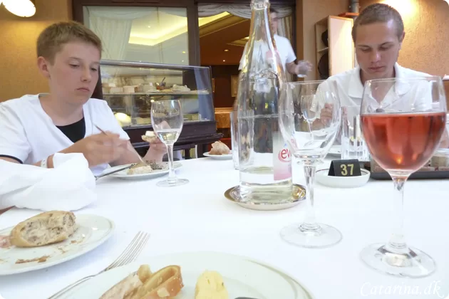 Søren og Sebastian vælger kanin med fori gras til forret. Christian og jerg “nøjes” med melon og skinke.Alle forretterne smagte os alle og vi glædede os hoveretterne. Drengene og Søren havde valgt noget kylling med delikat tilbehør, jeg noget fisk som var fanget i søren, jeg mener det var en See bass, altså aborre. Til desset, valgte Sebastian hindbærsorbet med vanilje parfait og hvid chokolade, vi andre tog ostetrollien, hvor der var et utal af oste at vælge imellem.