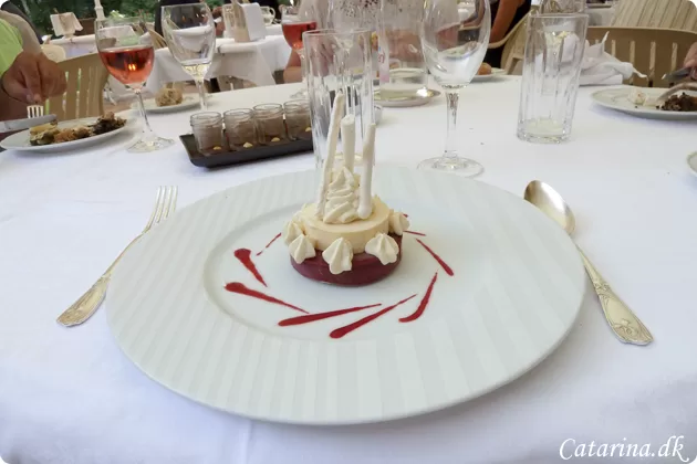 ~Hindbærsorbet med vanilje parfait og hvid chokolade.