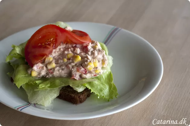 De to dåser tun drænes lige lidt inden de komme i en skål og deles med en gaffel, derefter hakker du den røde pepper i fine små firkanter og komme den ned til tunen sammen med majs og ærter. Derefter tilsætter du youghurten og mayonasen og rør godt rundt. smag til med salt og peber. Velbekomme. 🙂