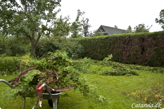 Jeg hentede min far klokken 8:30 og havde lige inden tjekket vejrudsigten, som ikke så alt for godt ud. Da vi kom herhjem, begyndte det at smådryppe lidt, men ikke mere end at vi godt kunne klippe. Min far vidste hvad der skulle gøres og der kom kan i ørnenæbet som noget af det første. der blev tyndet godt ud i de store tykke grene og da de værste var ryddet af vejen startede han hækkeklipperen og arbejdede sig stødt og roligt igennem hækken. Jeg var håndlanger og sørgede for at at min far kunne se gå uden at vade alt for meget rundt i afklip og indimellem var der tykke grene som klipperen ikke kunne klare, dem snuppede jeg med ørnenæbet.