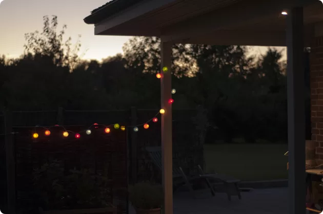 Da vi var i Thailand tidligere på året, købte jeg nogle meget farvestrålende små runde lamper på natmarkedet i Hua Hin. Jeg tænkte at de kunne se ret festlige ud på terrassen, sådan en dejlig sommeraften. Jeg havde faktisk helt glemt dem indtil Daniel skulle flytte, for inde bagerst i skabet på hans værelse, fandt jeg lamperne. Jeg fik sat et andet stik på og så blev de ellers hængt ud på stakittet ved terrassen, så de kunne lyse lidt på her i lørdags hvor jeg jo holdt fødselsdags tam-tam.