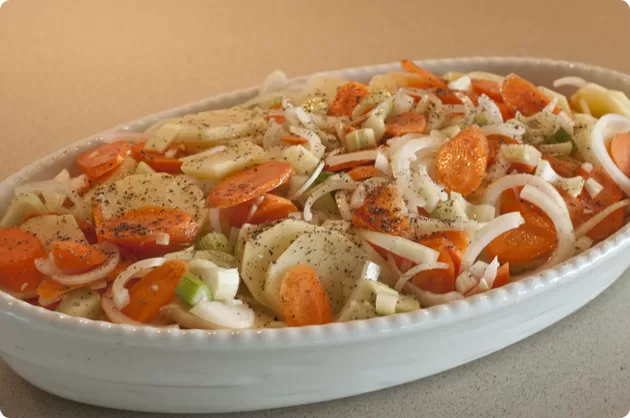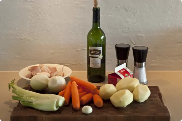Rens grøntsagerne og skær dem i tynde skiver og læg dem i et ovnfast fad sammen med den hakket hvidløg. Hæld hvidvinen hen over og kværn salt og peber over.
