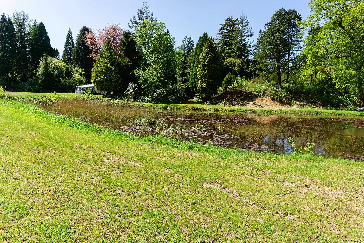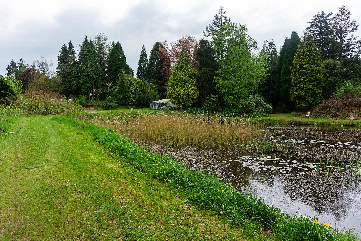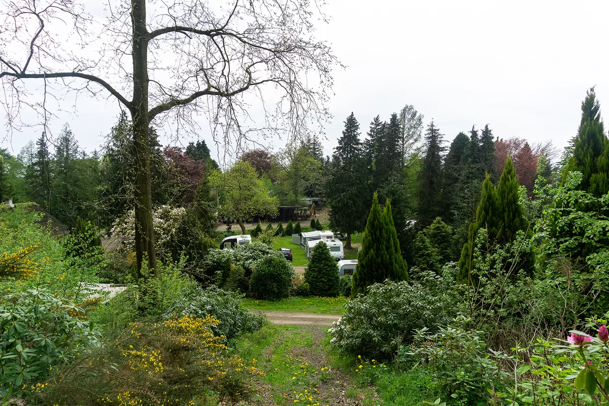 Mange steder er bevoksningen dog så tæt, at der kun lige er plads til et lille telt, men hvis man er cykelturist, er det jo også det eneste man har med. Rundt om på pladsen er der små vandhuller og småsøer med guldfisk og karper. Der er også et bålsted som alle er velkommen til at benytte og Peter skal nok sørge for brænde.