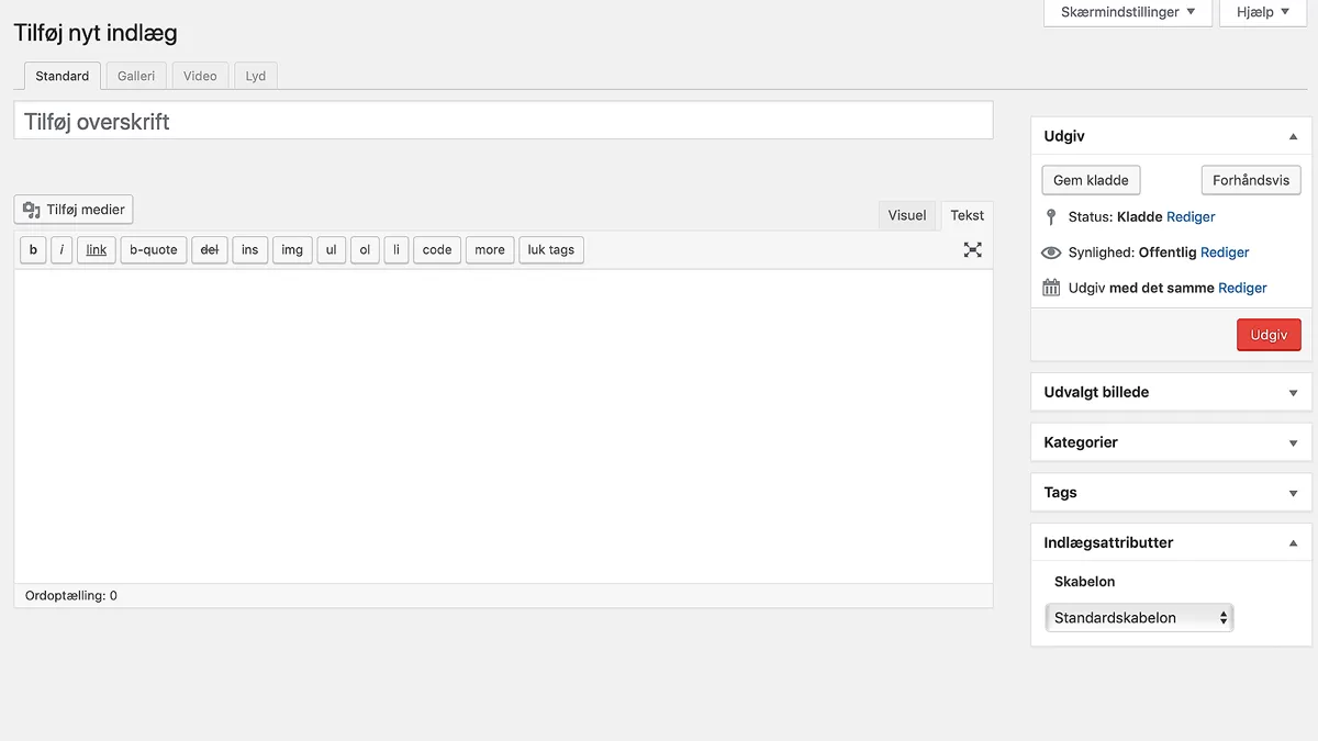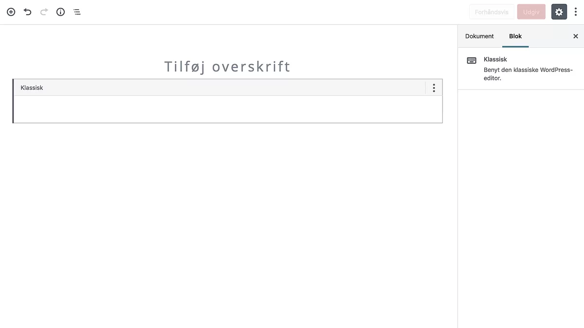 Sådan her ser Gutenberg Editoren ud inde bag ved bloggen her, med blokken klassisk valgt: