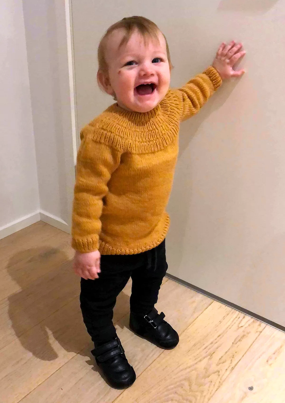 How adorable… both the boy and the sweater! That colour is so beautiful.