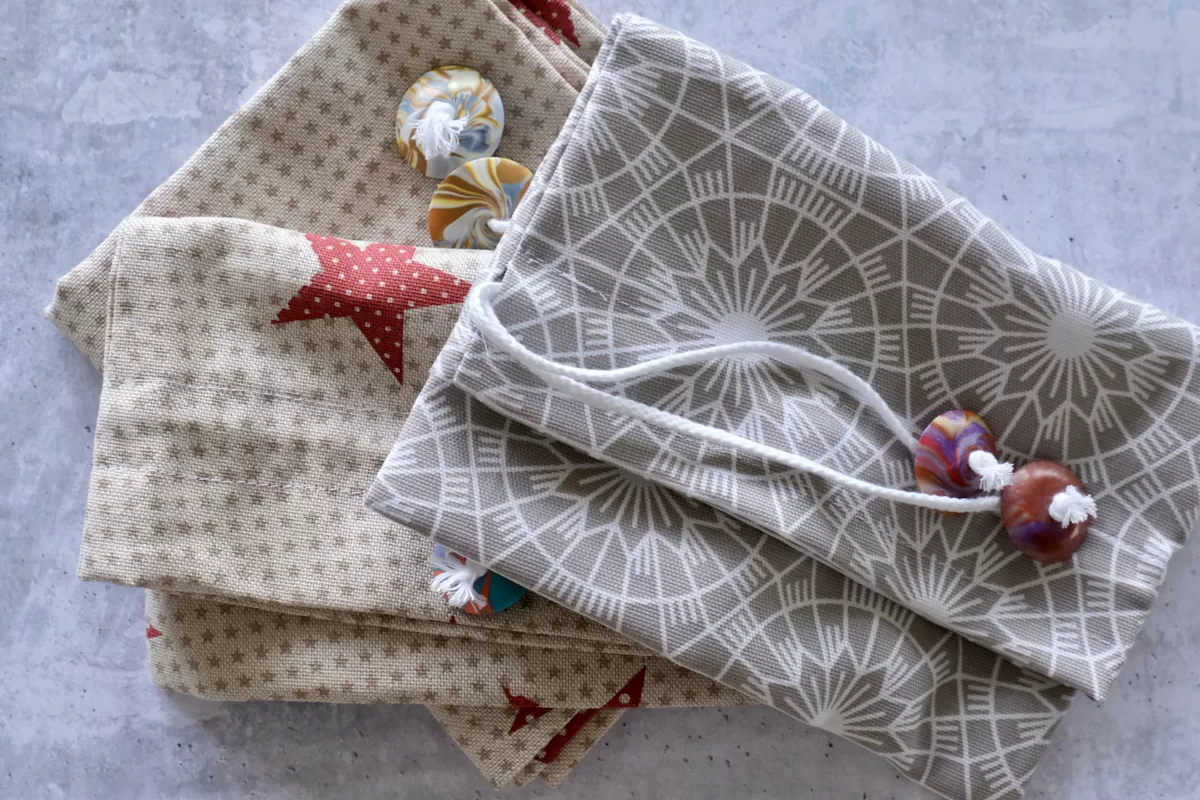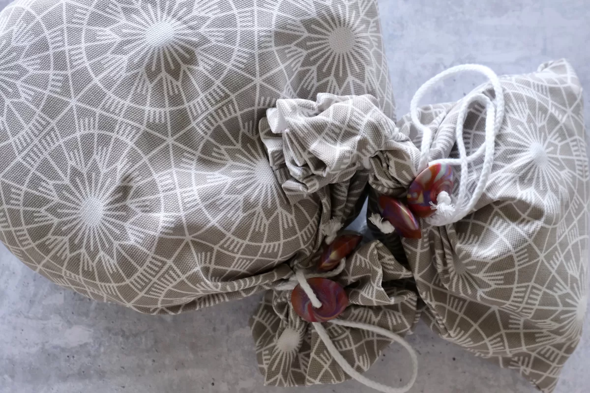 Den kan stadig genanvendes mange mange gange, men nu er der sket en videreudvikling af den oprindelige pose. Der er nu kommet løbegang i og tilføjet hjemmelave knapper til snorene, så det er endnu lettere at lukke posen.