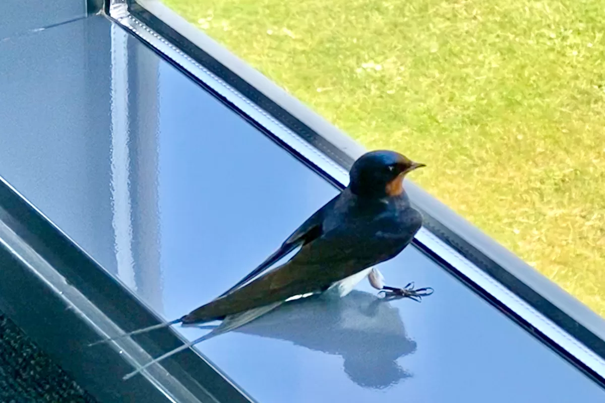 Ved fælles hjælp, fik vi skræmt-viftet-lokket, eller hvad vi nu gjorde, de to svaler ud igen. Den ene fløj ud af den dør den var kommet ind af, den anden ud af et af de vinduer vi have åbnet til formålet.