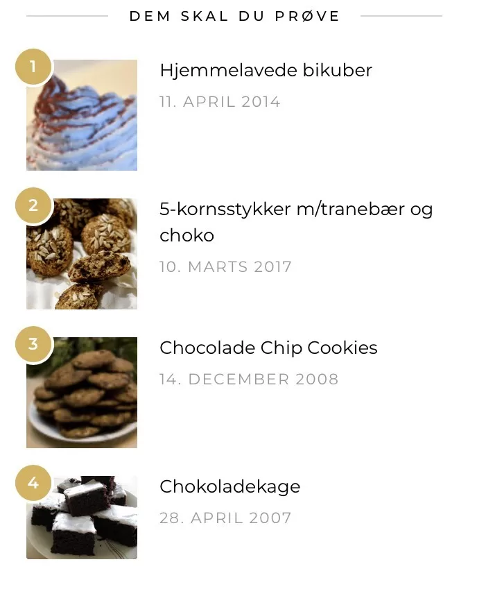 Der er også sket lidt når man klikker ind på et indlæg, for jeg har rykket kommentarfeltet op over relaterede indlæg – eller som jeg kalder dem MÅSKE OGSÅ DETTE HAR DIN INTERESSE… – og kikker du ud i sidebaren, er der nu er et par “must-try” eller nogle opskrifter som du bare må prøve.