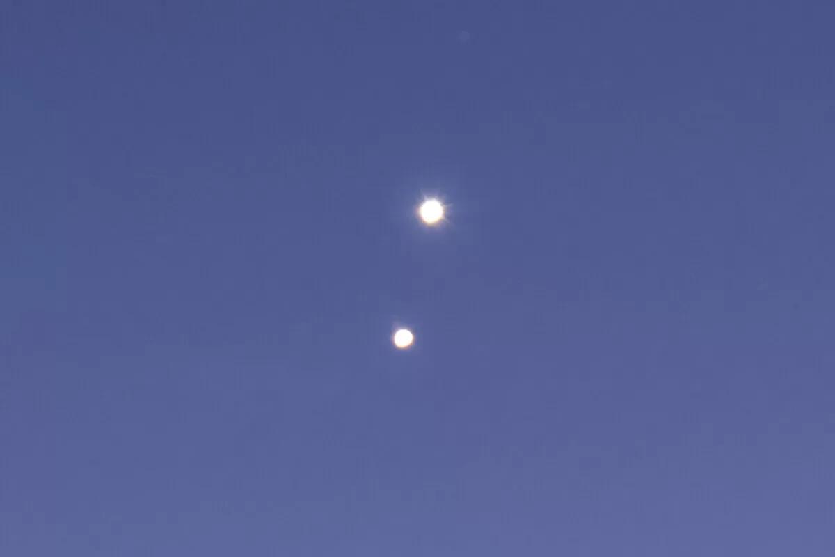 Her i går og i dag, den 1. og 2. marts 2023 er Venus og Jupiter så tæt på hinanden, at det er lige før de kan kysse hinanden. Nogle steder på jorden, gør de det faktisk, men her i Danmark, vil der være en lille og anstændig mellemrum mellem dem. Det er første gang siden 2015, de er så tæt på hinanden, og de vil ikke være så tæt igen før 2039.